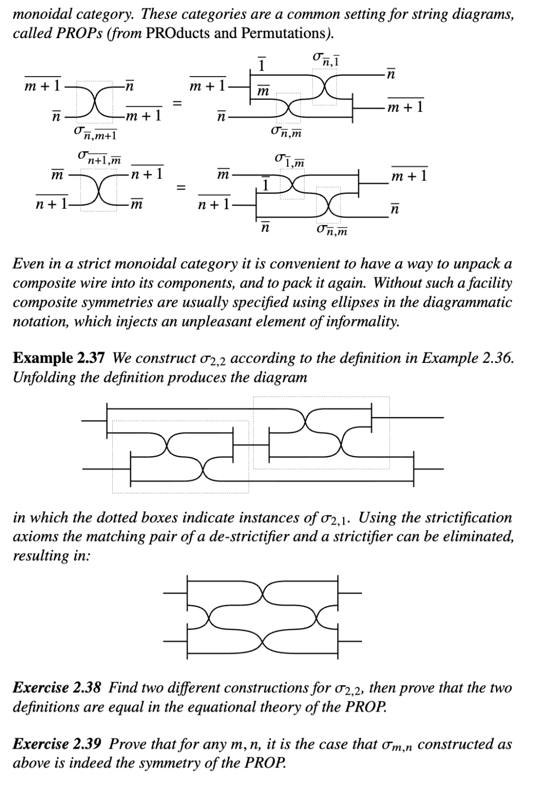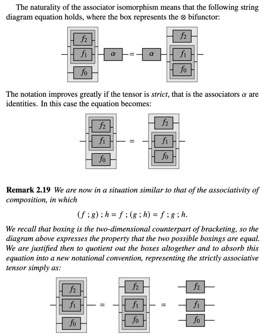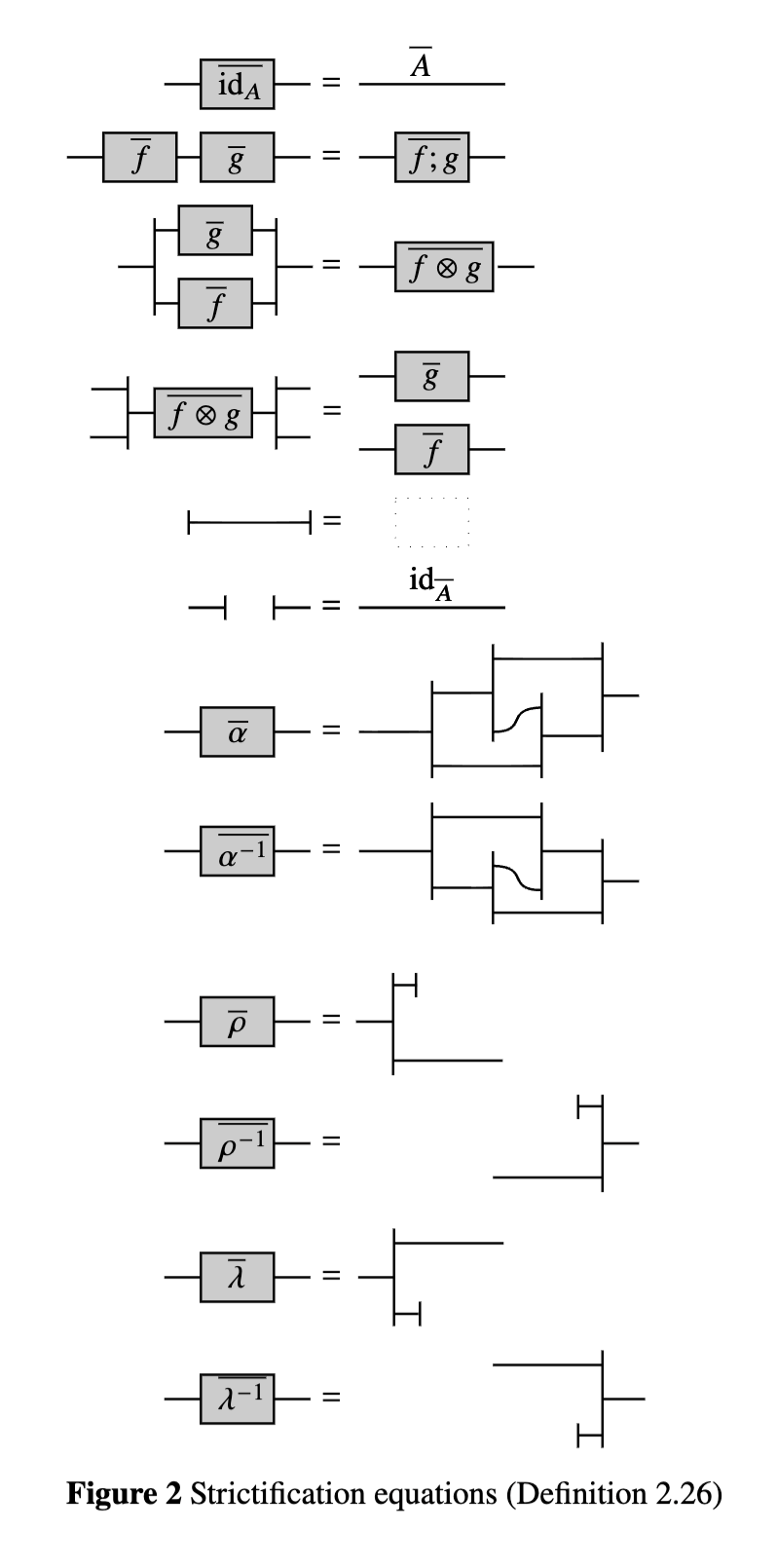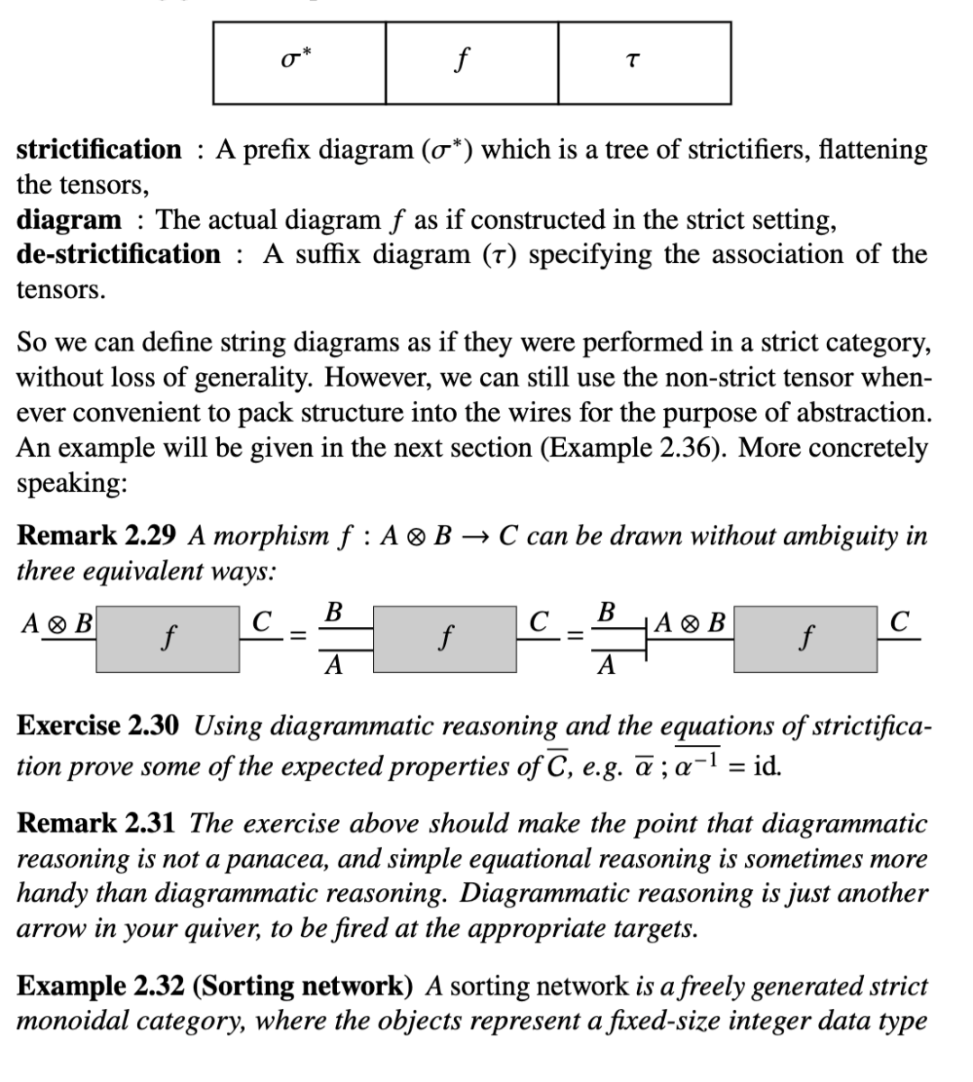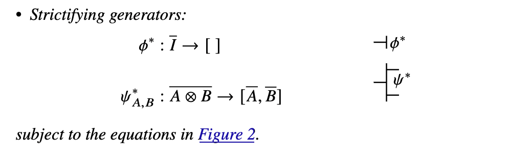 由于我们的总体意图是为编程语言定义弦图,我们通常不能假设张量是严格的。但如果没有严格性,张量的函子框就失去了其简化性质,因此图形记号也失去了其优雅性。这似乎是一个不可逾越的障碍,但使用严格化存在一种原则性的出路。正如我们将看到的,这种构造以一种导致新范畴的方式引入了一个刻意严格的幺半张量版本,该新范畴与原范畴等价。图形化呈现应该能更清晰地说明正在发生的事情。