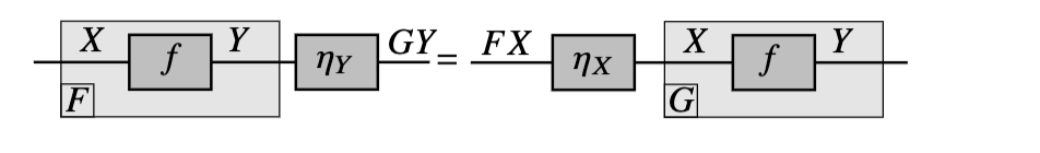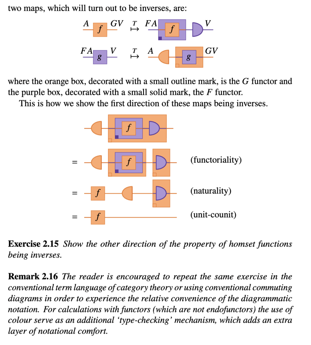 注记 2.12 我们可以认为,图形记号法此时已经开始显现成效了。弦图更直接地表明,自然性是交换性的推广,它利用函子性和索引作为一种巧妙的方式,使得映射 ff的源和目标与自然变换中精心选择的分量的源和目标相匹配。此外,正如我们稍后将看到的,在使用弦图进行计算时,将更容易识别公式的“可约式”(redexes),即公式中可以应用方程的位置。