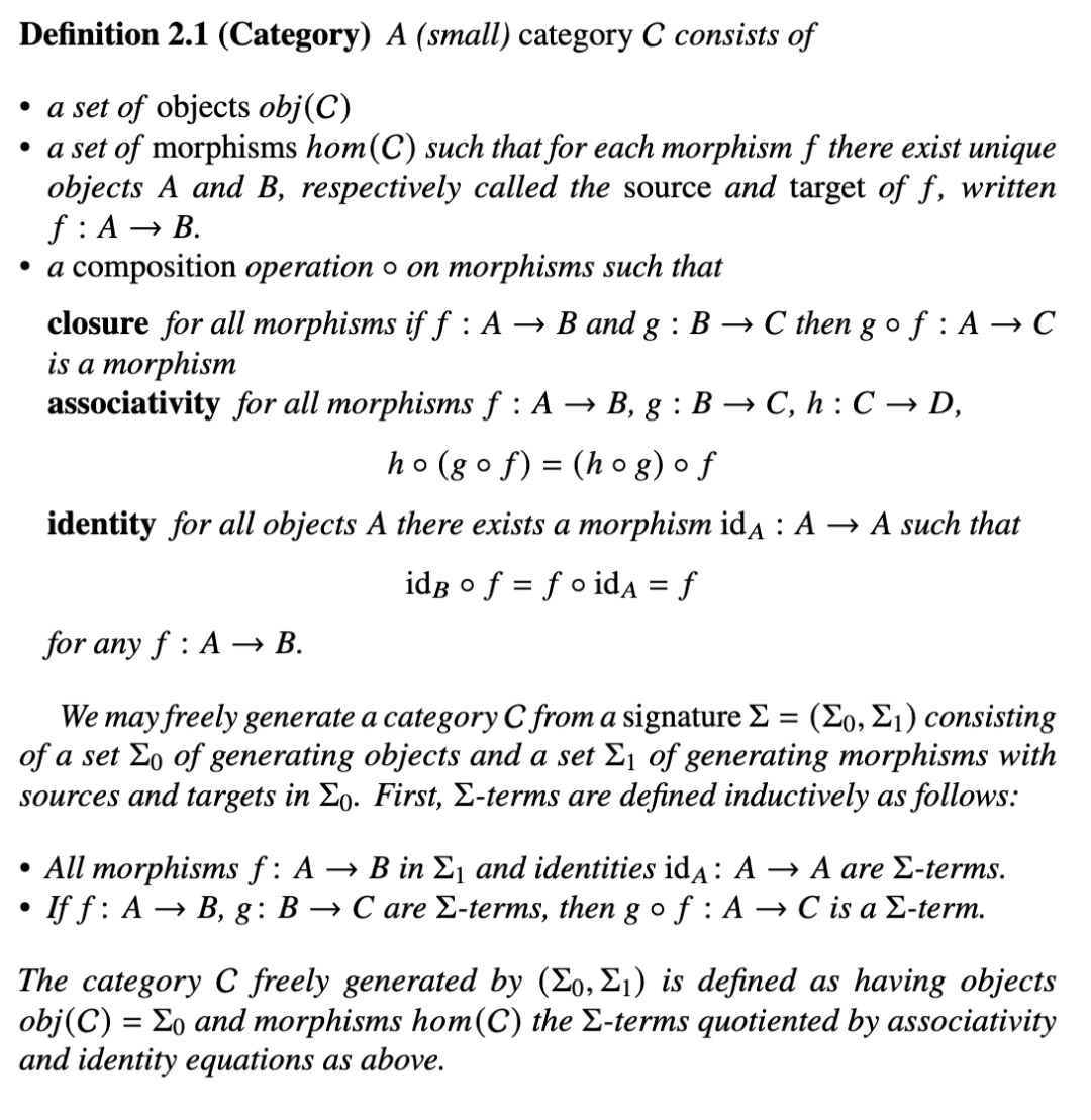 表述的风格既不是纯粹理论的也不是纯粹实践的,而是一种“技术转移”。具有范畴论背景的读者应该能够找到真正的实际应用,希望这将启发他们的工作并允许他们与编译器编写者交流和协作。具有编译器开发背景的读者应该发现自己被提醒使用范畴论的可能性,不仅作为语义框架,不仅作为类型论框架,而且作为语法框架。最后,本作旨在作为教程阅读,而非综合综述或参考手册。为了最小化干扰,我们将把所有参考文献和讨论留到特殊的子章节中。