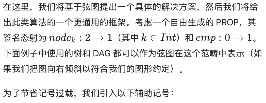 弦图。项和图之间的概念桥梁是弦图。作为一项新发展,根植于理论物理和范畴论,弦图理想地适合此目的。它们在某种意义上是语法的,即它们可以由文法生成,但它们是二维的而不是线性的,就像矩阵的标准记号是一种二维语法一样。二维语法,如果以某种方式书写,使得图表示直观且其形式化不足为奇。
