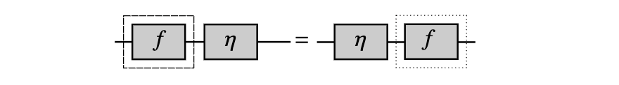 移除严格结合的函子框,是项的一维记号中移除结合运算括号的二维版本。在单位约束的情况下会出现类似的情况,其中自然性条件,用图形表示,是: