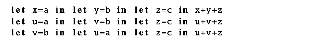 在更复杂的语言的情况下,带有变量和绑定,从线性语法转向平面语法可以吸收更多这样的等式性质。考虑以下的项,其中 let 引入并绑定一个变量: