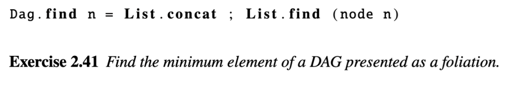 其中 List.reverse 是通常的列表反转函数。同样,局部修改 DAG(通过用另一个 DAG 替换一个节点)的函数也很容易实现;它们被留作练习。忽略 DAG 形状的函数也是微不足道的,因为 DAG 可以被展平为一个列表。如果需要,结构元素(恒等和对称)可以被过滤掉。在 DAG 中查找元素 n只需在展平的列表列表中搜索它即可完成: