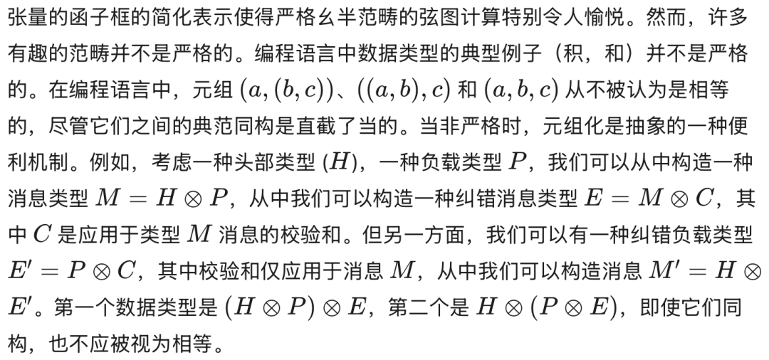 一个在数学、物理和计算机科学许多领域特别重要的双函子是幺半张量,⊗ : C × C → C,因为它可以用来建模从更简单的数据类型构建聚合数据类型。幺半张量在同构意义上是结合的,表明数据可以用不同但可以通过规范方式彼此恢复的方式进行聚合。这一性质对积类型和和类型都成立,它们都是幺半张量的实例。如果张量是严格结合的,即同构是恒等映射,则称其为严格的。一旦我们在范畴中引入严格幺半张量,弦图的图形语言才真正开始发挥其全部潜力。