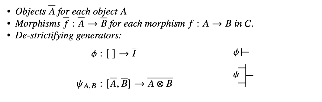 如前一节所讨论,在严格设定下工作更为简单,并且仅当需要非严格张量运算时,才全局地添加严格化子和去严格化子态射。