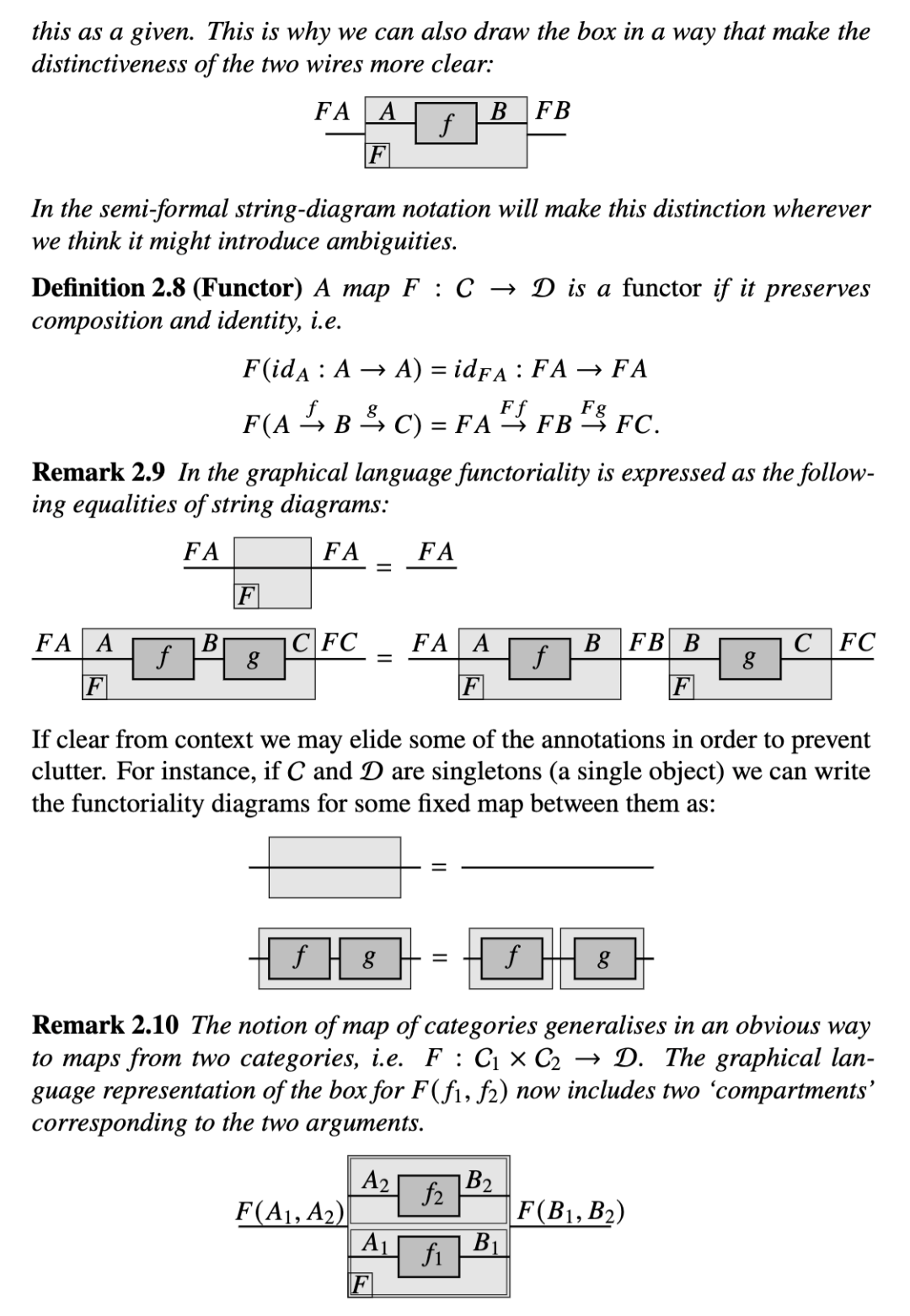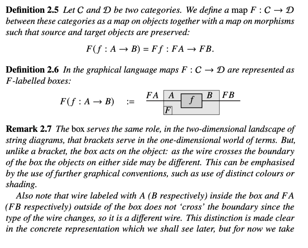 除非为了消歧,否则不绘制内部隔间。既是两个范畴的映射又是函子的被称为双函子。在下文中,除了简要引入幺半范畴的定义外,我们将不使用双函子框,之后就不再需要它们了。