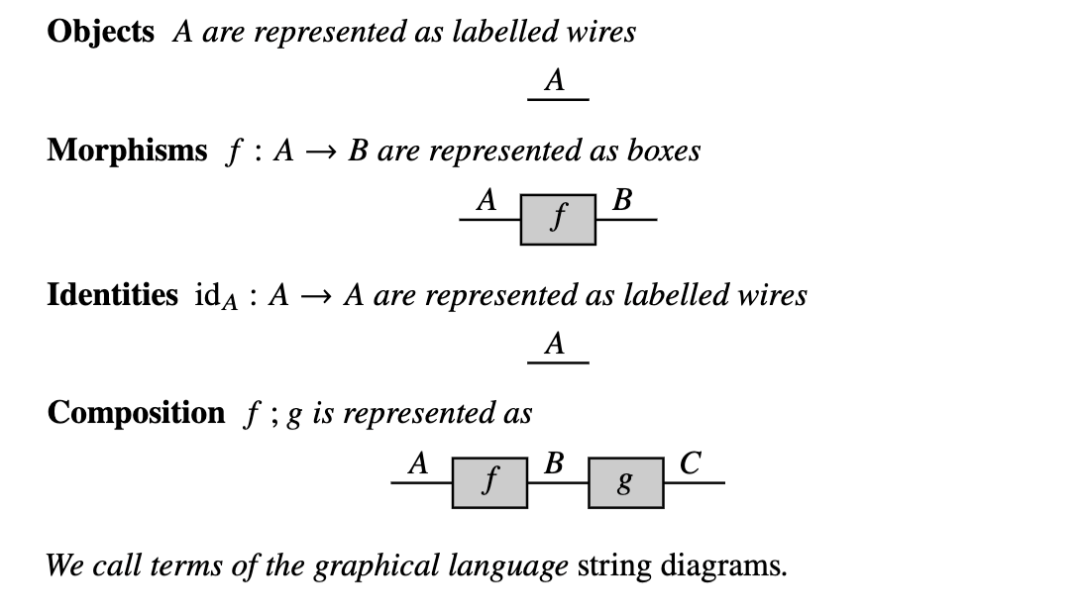 我们现在已经定义了严格幺半范畴的核心图形记号。总结如下,它是一种带标签的框和线的语法,其中框代表态射,线代表对象。态射通过串行连接线进行复合,而幺半张量则是图的并行堆叠。张量单位的恒等可以通过将其表示为空白空间来省略。