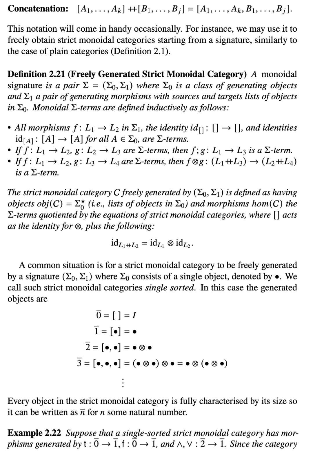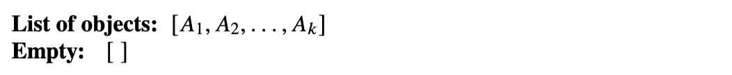 在严格幺半范畴中,对象本质上是列表,单位 I 是空列表。我们引入记号来定义列表及列表上的基本操作,这对于处理严格幺半范畴中的态射十分方便。