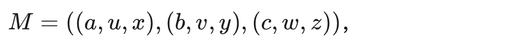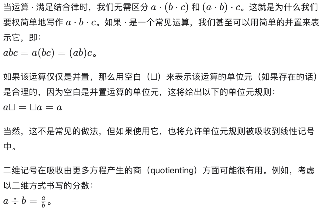 这提出了一个比较记号法的标准:如果一个记号法能吸收更多的方程,那么它就更好。我们的意思是,在改进后的记号法中,两个项变得在语法上相等,从而不再需要使用显式的方程来标识它们相等。平面记号法相较于线性记号法还有一个额外的优势,即它能使某些记号不变量变得显而易见。例如考虑矩阵,它们最常以二维语法书写: