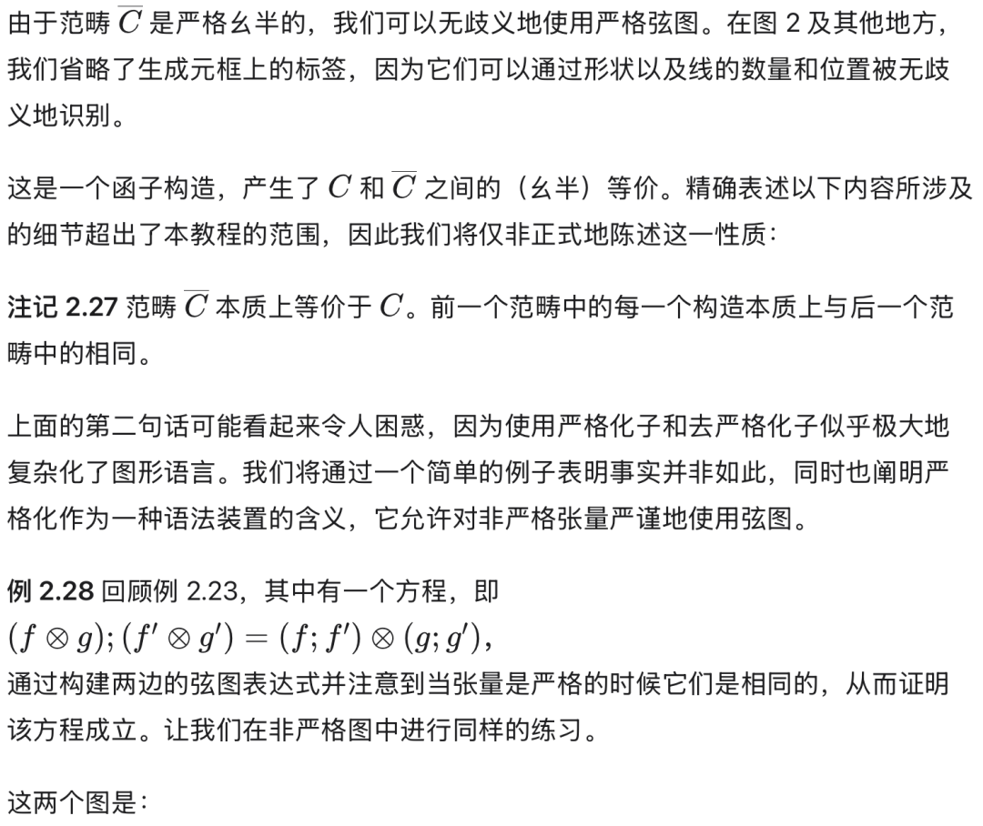 原始论文,以及实际上随后的几乎所有文献,都在严格幺半范畴的背景下运作。非严格范畴的问题被相当简略地驳回了:“原则上,大多数在假设张量范畴是严格的情况下获得的结果可以被重新表述并在没有这个条件的情况下被证明。”(第 59 页,出处同上)。在数学上这也许是真的,但如果我们要认真考虑将弦图作为形式语法,细节显然值得详细说明。弦图的严格化的这种仔细说明是在 (Wilson, Ghica, & Zanasi, 2022) 中完成的。