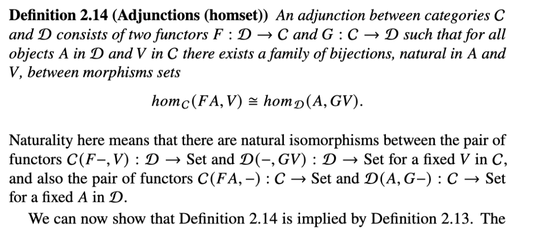 两个彼此处于某种特定关系中的函子被称为伴随的。伴随函子在数学和计算机科学中很常见。我们此刻暂不举例,仅介绍定义和性质,例子将在稍后给出。