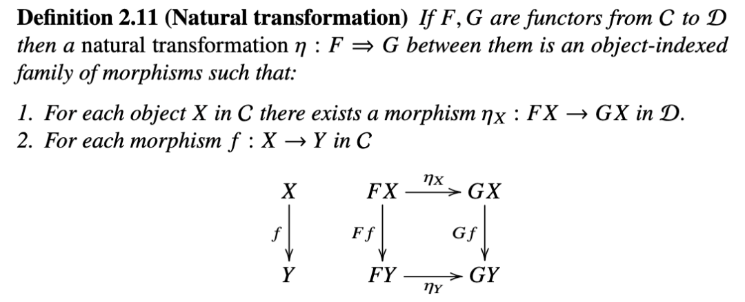 沿着抽象阶梯继续向上攀登,自然变换可以被视为函子之间的映射。它们是由源范畴中的对象索引的态射集合,这些态射在目标范畴上是“均匀”的。均匀性性质定义如下。