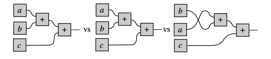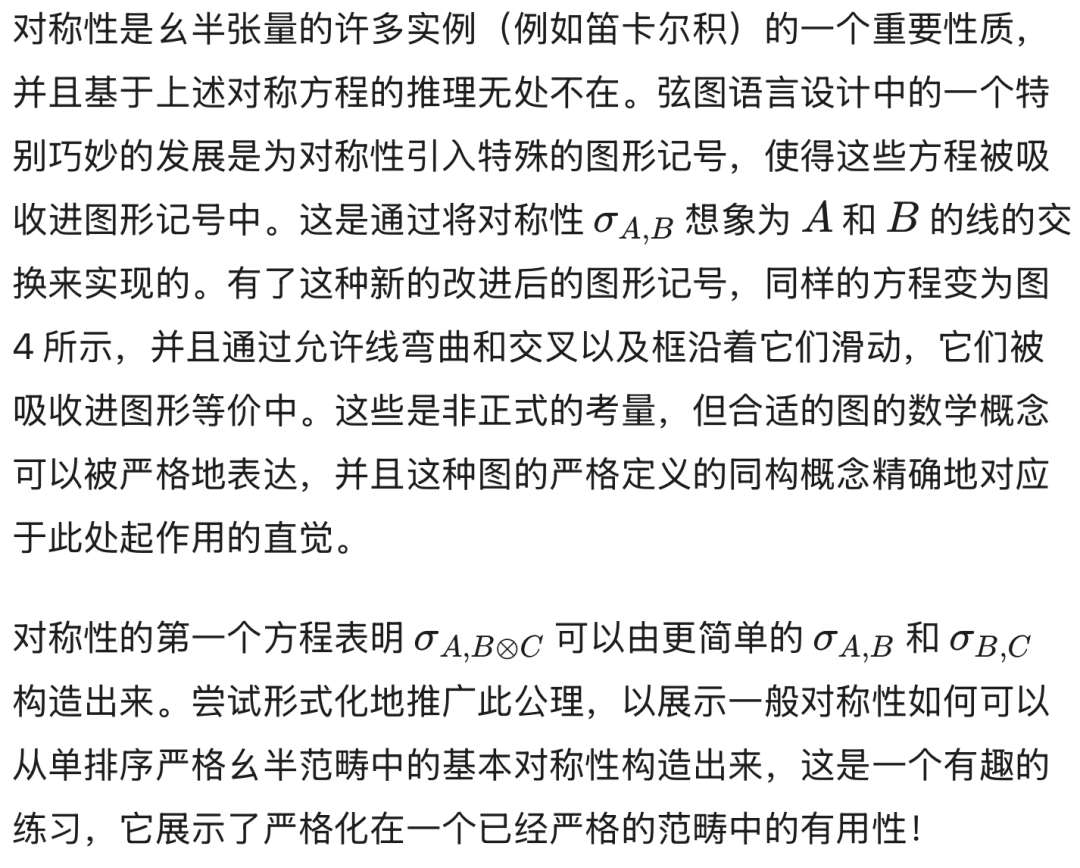 更具体地说,如果使用无括号形式 f;g;h;i;j,我们如何插入括号并不重要,因为所有的加括号方式都会产生虽然在句法上不同但相等的表达式。因此,无括号表达式代表了按结合律商化后的句法项的等价类。这是数学中针对结合运算非常常见的一种句法技巧,我们自动地使用它,而未曾深思。但是,利用记号约定根据其语义对句法对象(项)的类进行商化的想法是很吸引人的,因为它不可避免地导向更简单、更抽象的记号。在这种情况下,我们说该等价性被记号吸收了。问题是:我们能将这一思想推广到其他句法结构吗?使用即将介绍的弦图,答案是明确的“是”。
