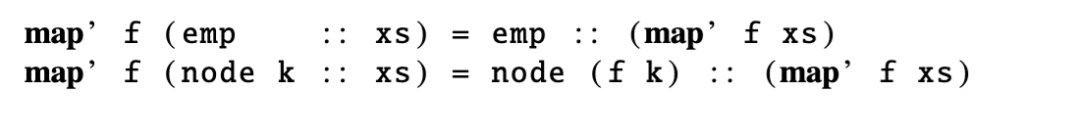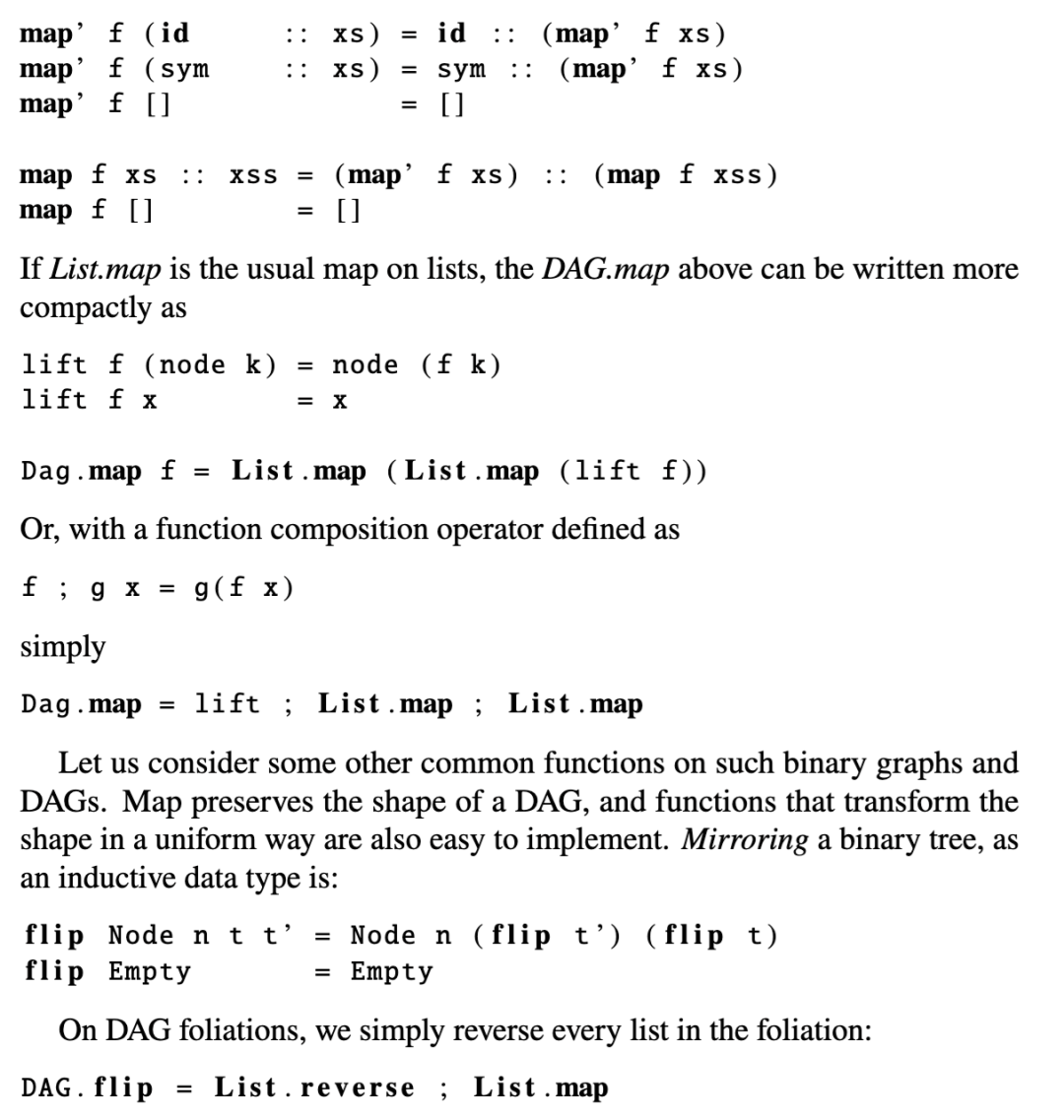 这种表示法的优势在于,现在我们可以为以叶状化形式呈现的有向无环图(DAG)编写一个通用的归纳 map 函数,需记住的是,自由生成的 PROP 的语言还包含恒等(id)和对称(sym)。然而,由于 map 函数保持了 DAG 的形状,它只需保留这些结构态射即可。