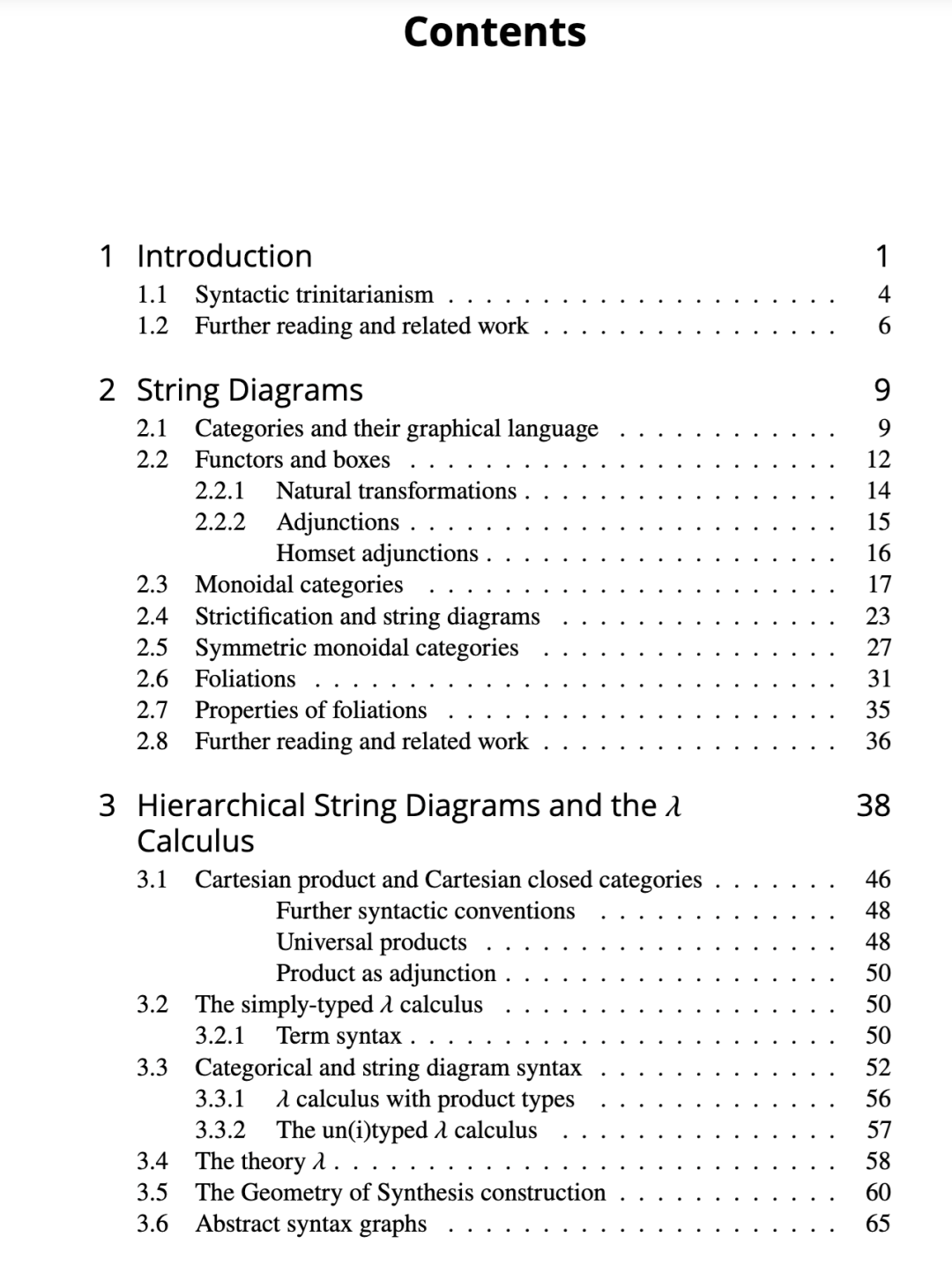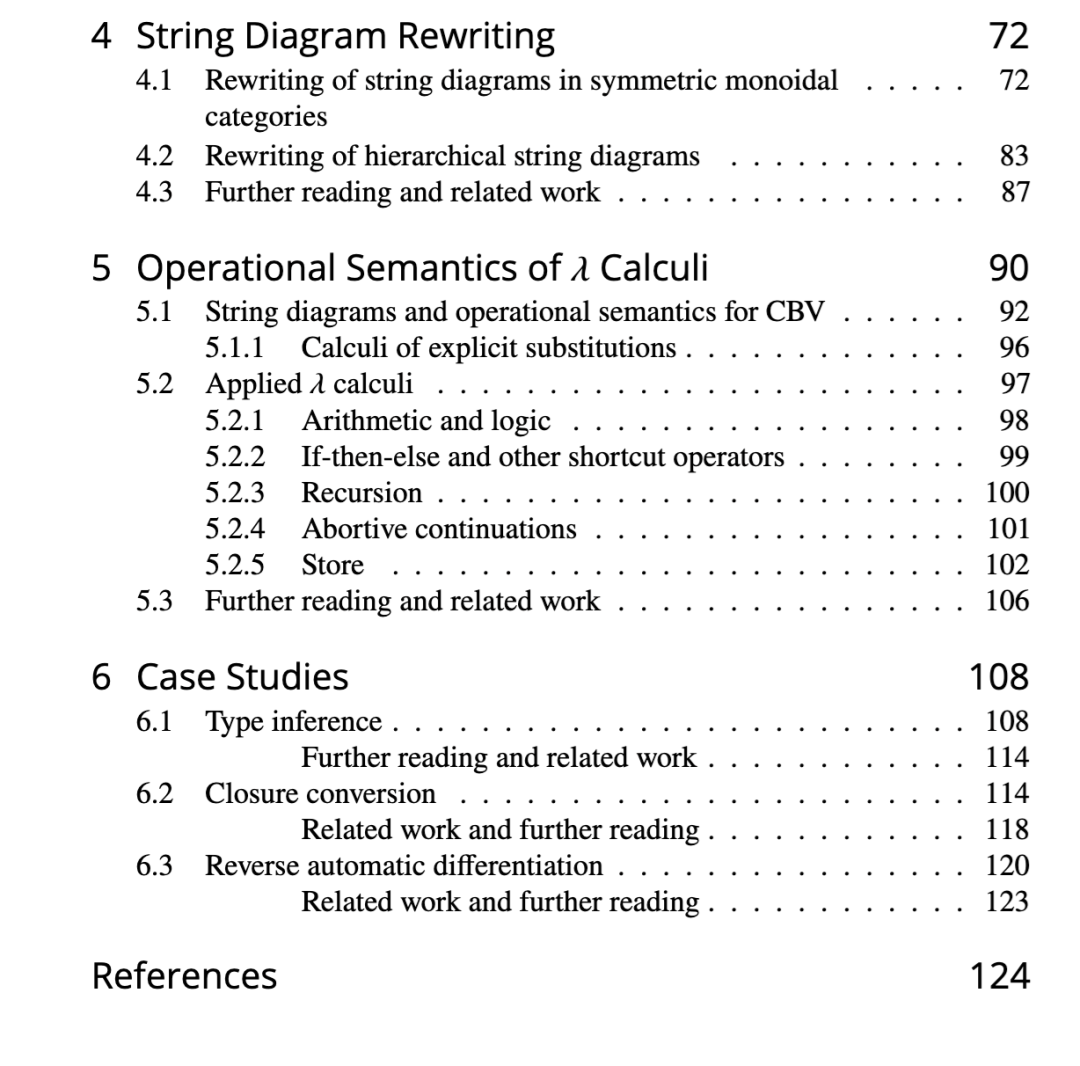 表述的结构是线性的,建议读者逐节进行。我们从第 2 节弦图的一般介绍开始,其中我们关注一些在标准文献中通常被忽视的结构,特别是伴随和严格化,但它们对于处理闭幺半结构是必不可少的。在此基础上紧密构建,我们在第 3 节介绍闭幺半范畴和笛卡尔闭范畴的弦图,并立即应用于λ演算的语法和等式理论。弦图的二维语法和图重写直觉之间的联系在第 4 节中被精确化。第 5 节将转向λ演算的操作语义,纯的但也扩展了操作进入更实用的编程语言。最后,在第 6 节我们给出弦图的三个非平凡应用:类型推断、闭包转换和反向自动微分。可以说,它们将提供一些证据,表明弦图导致了一些已知算法的更清晰和更有洞察力的版本,这些算法在它们基于项的表述中,被认为有时极其复杂。