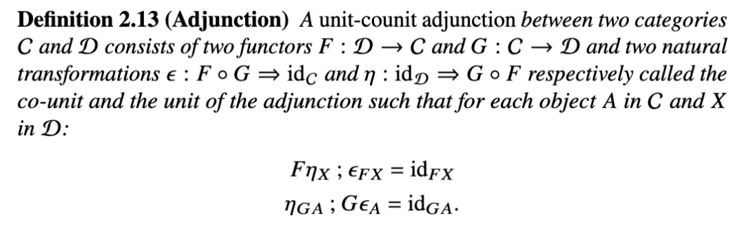 伴随可以用几种方式来刻画,但我们将强调最适合在弦图图形语言中进行优美呈现的定义,即所谓的单位-余单位伴随(unit-counit adjunction)。