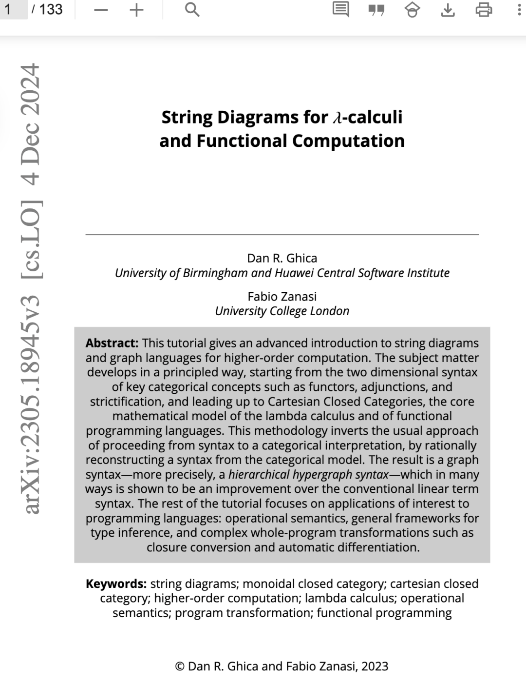 本教程给出了关于用于高阶计算的弦图和图语言的高级介绍。主题内容以原则性的方式展开,从关键范畴论概念(如函子、伴随和严格化)的二维语法开始,直至笛卡尔闭范畴,后者是λ演算和函数式编程语言的核心数学模型。这种方法论逆转了从语法进展到范畴论解释的常规方法,而是通过从范畴模型理性地重构语法。结果是一种图语法——更确切地说,是一种分层超图语法——其在许多方面被显示为优于传统的线性项语法。教程的其余部分专注于与编程语言相关的应用:操作语义、类型推断的通用框架,以及复杂的整个程序变换,如闭包转换和自动微分。