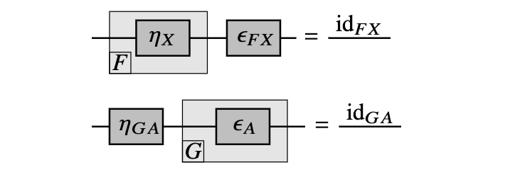 如果两个函子如上定义是伴随的,我们称 FF 为左伴随,GG 为右伴随,记作 F⊣G。 使用弦图,这两个图方程在图形化呈现中变得极具启发性: