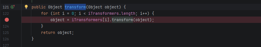 ChainedTransformer 里的 transform 方法会依次调用 iTransformers 链条里所有对象的 transform 方法: