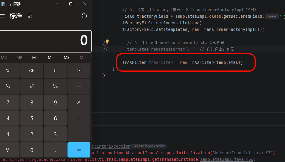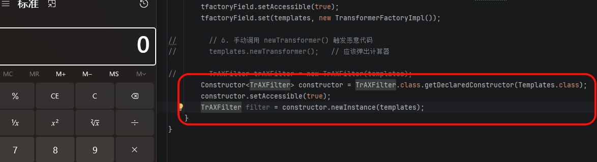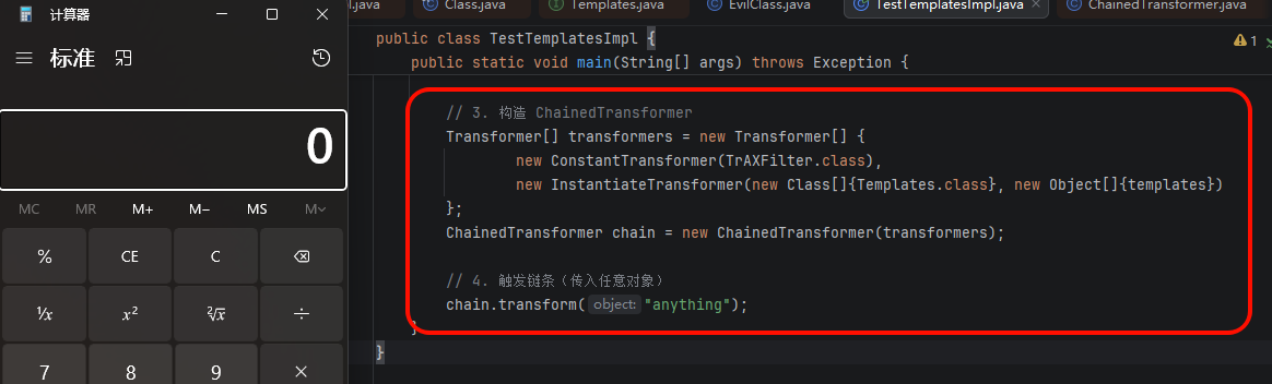 new ConstantTransformer(TrAXFilter.class):ConstantTransformer 的 transform(Object input) 方法会忽略输入参数,直接返回构造时指定的常量(这里是 TrAXFilter.class)new InstantiateTransformer(new Class[]{Templates.class}, new Object[]{templates}):InstantiateTransformer 的 transform(Object input) 方法会把输入当作一个类(Class),并用构造时指定的参数去实例化那个类。输入正好是上一步输出的 TrAXFilter.class,所以它执行 new TrAXFilter(templates),从而触发 TrAXFilter 构造方法中的 templates.newTransformer(),最终执行恶意代码chain.transform(任意对象) → ConstantTransformer 返回 TrAXFilter.class → InstantiateTransformer 接收这个 Class,实例化 TrAXFilter → 弹计算器效果: