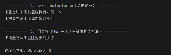 System.out.println("\n========== 2. 反射 newInstance(类已加载,只触发构造方法) ==========");