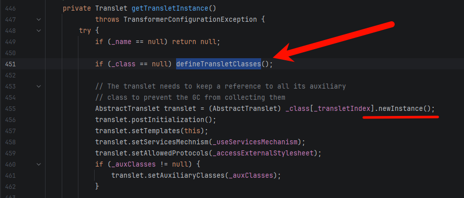 TemplatesImpl 内部在 defineTransletClasses() 里会做一个类型检查,要求加载的字节码对应的类必须是 AbstractTranslet 的子类,否则会抛异常。这是 XSLTC 的设计要求,我们必须满足它。
