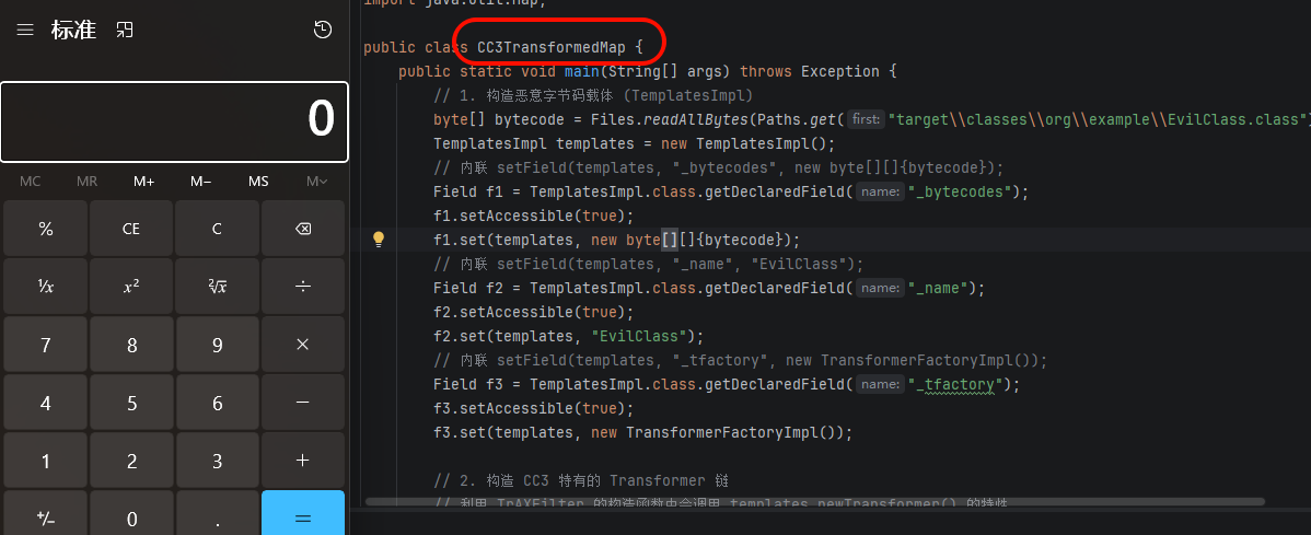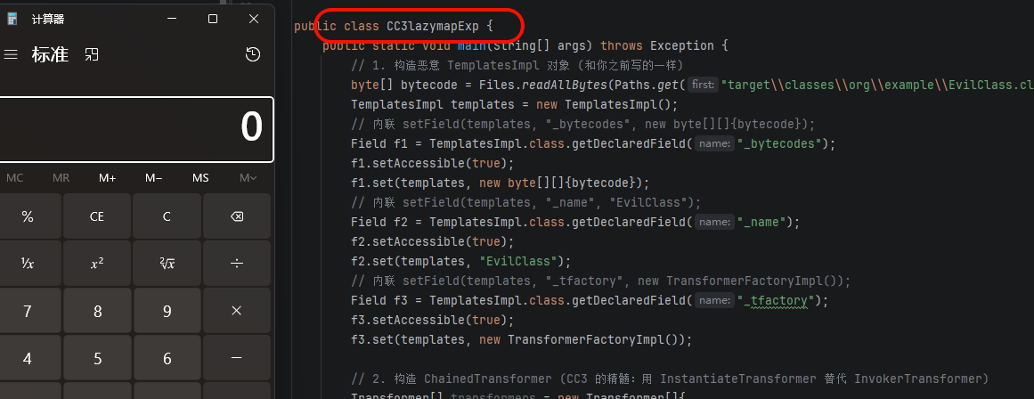 };两者都能弹出计算器,但 CC3 通常指的是第二种,因为它展示了 InstantiateTransformer 的用法,且不依赖 InvokerTransformer 的反射调用(虽然本质还是反射)。第一种更像 CC1 的变种。