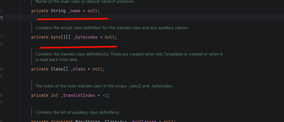 TemplatesImpl templates = new TemplatesImpl();接下来需要传参赋值,必须设置 _name 和 _bytecodes。但这些字段全部都是私有的: