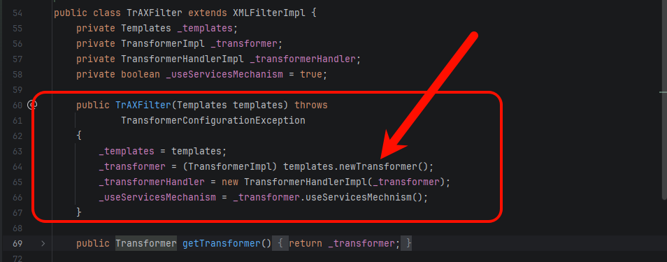 // 利用 TrAXFilter 的构造函数中会调用 templates.newTransformer() 的特性