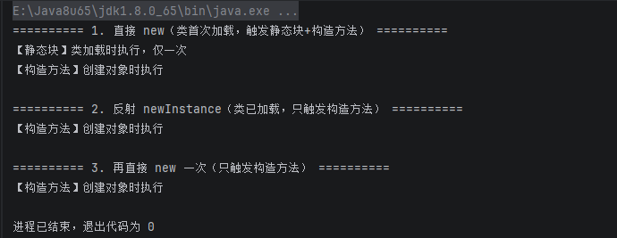 System.out.println("========== 1. 直接 new(类首次加载,触发静态块+构造方法) ==========");