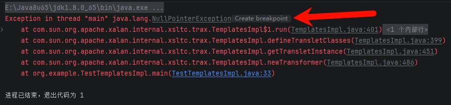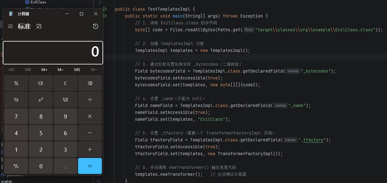 byte[] code = Files.readAllBytes(Paths.get("target\\classes\\org\\example\\EvilClass.class"));然后创建 TemplatesImpl 对象: