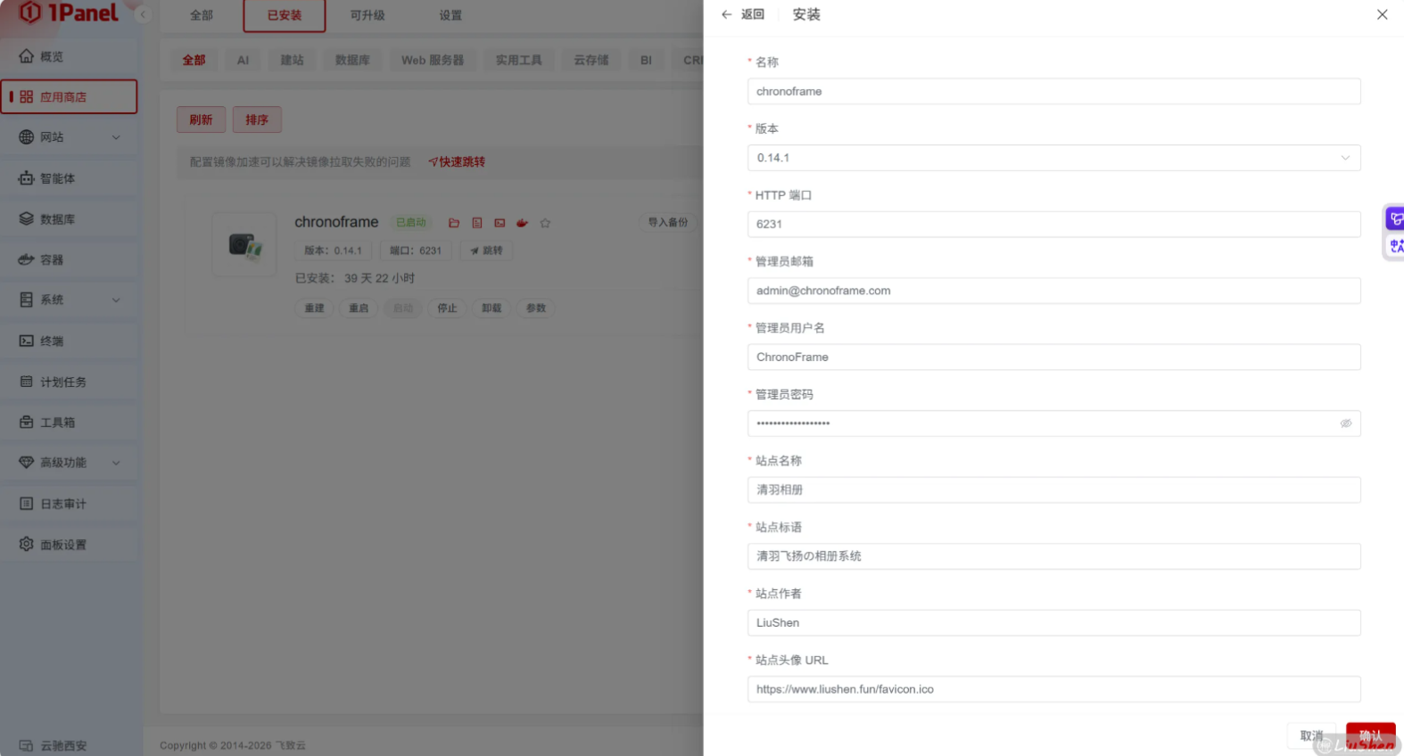 ghcr.io/hoshinosuzumi/chronoframe:0.14.1这里为本地存储,如果你打算将图片存到服务器本地,可以直接启动,修改账号密码和邮箱即可。