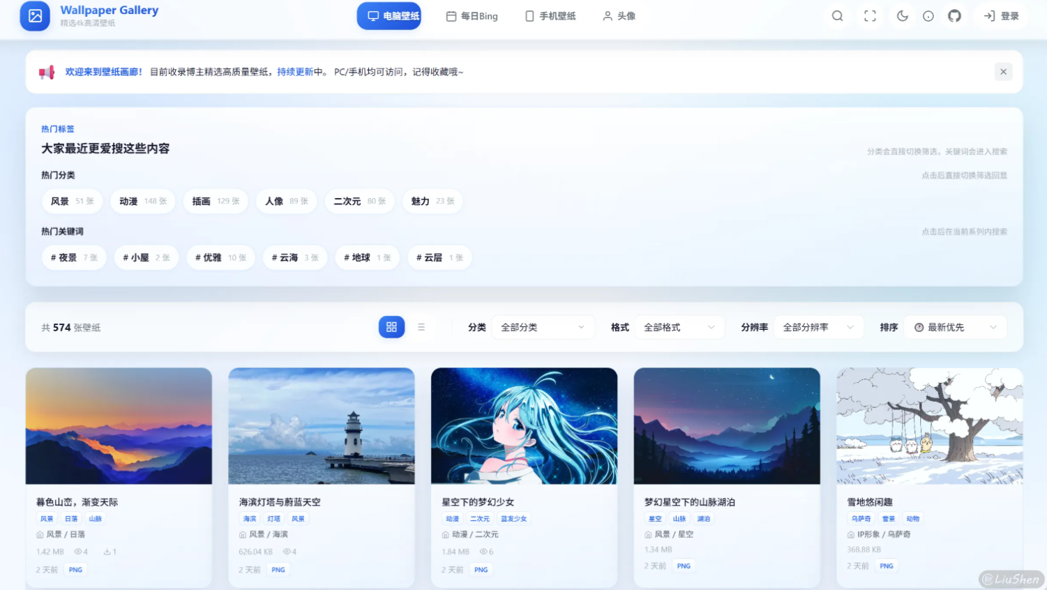 除了这个,我还发现了一个相册站,与其说是相册站,不如说是壁纸站,并且自带图源,可以直接搭建一个免维护,带登录功能的图片采集站,不仅可以自己上传图片,也可以实现自动聚合各类壁纸,比如每日一图Bing等等,项目如下: