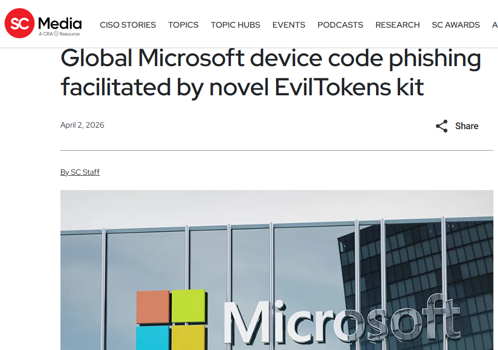 2026 年 4 月全球爆发的 EvilTokens 钓鱼即服务攻击,以 OAuth 2.0 设备码授权流程为核心突破口,针对 Microsoft 365、Azure AD 等平台实施规模化账号劫持,波及美、加、法、澳、印、瑞士、阿联酋等多国机构。攻击者通过仿冒财务类邮件诱导跳转伪造验证页面,欺骗用户在微软官方设备登录页完成授权,从而窃取访问令牌与刷新令牌,实现邮件、文档、Teams 数据窃取及商业邮件欺诈。该攻击利用合法协议、可信云服务与多跳跳转绕过传统网关检测,具备高隐蔽性、强扩散性与低门槛特性。本文以 EvilTokens 攻击事件为实证样本,系统解析设备码流原生机制、攻击全链路、关键技术实现与社会工程学诱导逻辑,构建包含令牌异常检测、行为基线建模、授权上下文增强、网关联动阻断的多层防御体系,并提供可工程化的检测代码示例。研究表明,设备码钓鱼的核心风险在于协议信任滥用与授权过程不可见,基于 UEBA 与零信任的持续校验可显著提升检测与拦截效能,为企业身份安全治理提供技术支撑与实践指引。