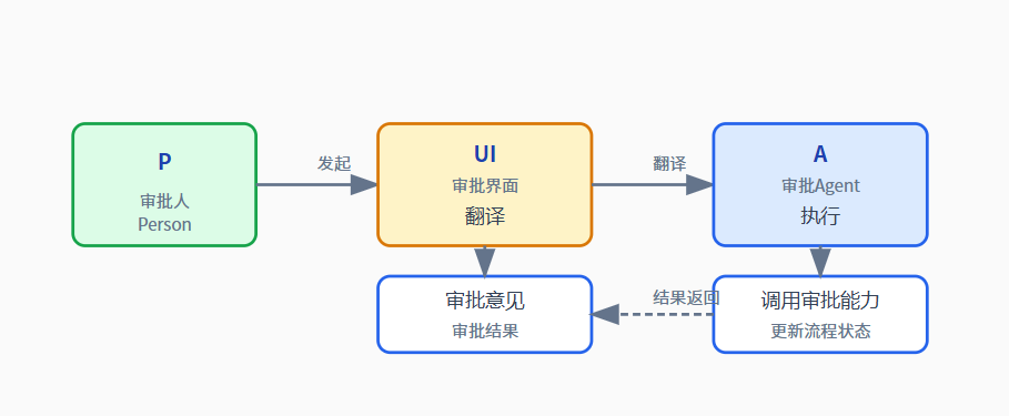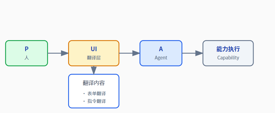 P 发起请求 ──► UI 翻译 ──► A 接收 ──► Workflow 路由