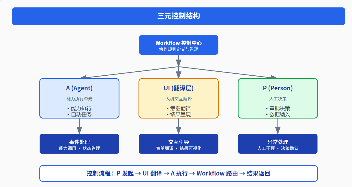 协作模式 | P2P 数据流转 | A/UI/P 三元控制 |