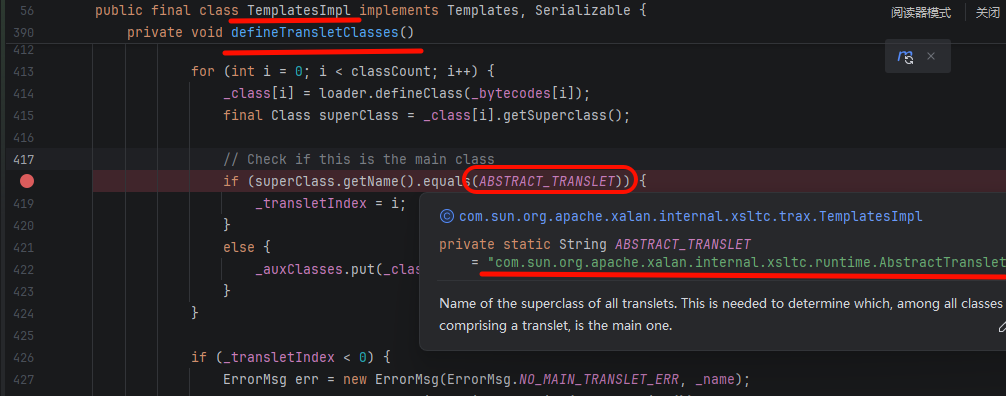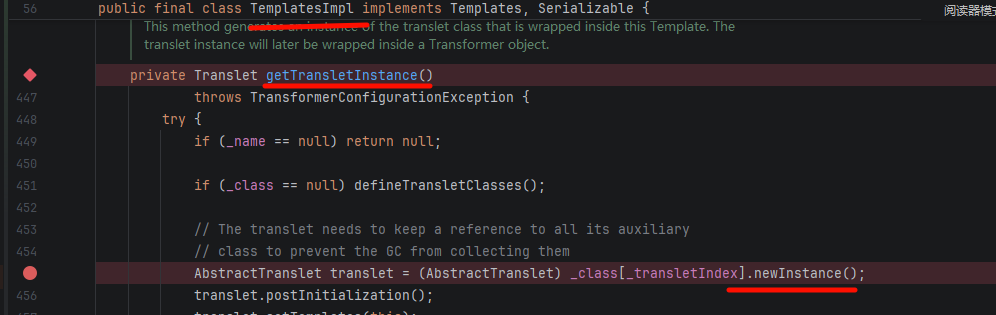 _tfactory 字段的必要性在 JDK 8u121 及之后,TemplatesImpl 的 getTransletInstance() 会检查 _tfactory 是否为 null,若为 null 会抛出 NullPointerException,导致无法实例化恶意类。因此高版本下必须反射设置 _tfactory 为一个 TransformerFactoryImpl 实例: