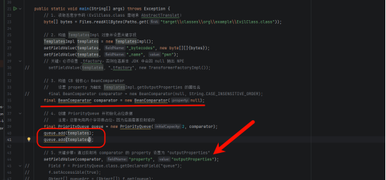PriorityQueue 在 heapify() 时会调用 compare 比较父子节点。两个相同对象(都是 templates)可以确保无论怎么比,都能触发 getOutputProperties()。