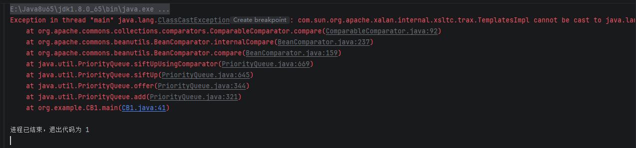 property 是 null 时,BeanComparator.compare() 拿不到属性值,直接把对象本身丢给内部的 ComparableComparator 比较,TemplatesImpl 没实现 Comparable,还是炸。