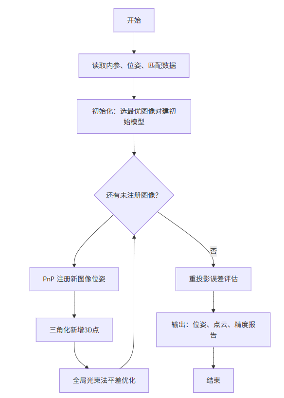 相比之下,引入带有噪声的 GNSS/IMU 先验(即“视觉惯性融合”场景),能为优化算法提供可靠的初始值(Initial Guess)和绝对尺度约束。这不仅能让非线性优化(Bundle Adjustment)更快收敛,还能让我们跳过繁琐的“从运动到结构”的艰难起步阶段,直接进入“增量式扩展与优化”的核心实现。