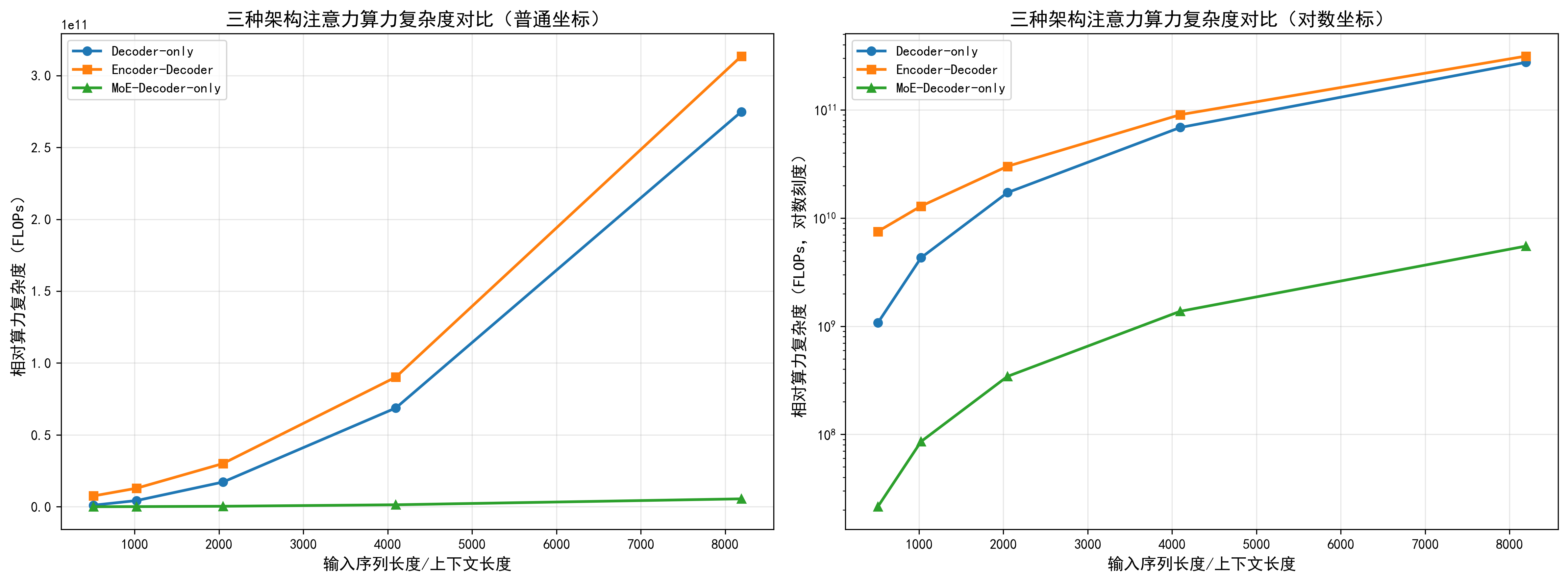 # 子图2:三种架构算力复杂度对比(对数坐标,更清晰展示MoE的优势)
