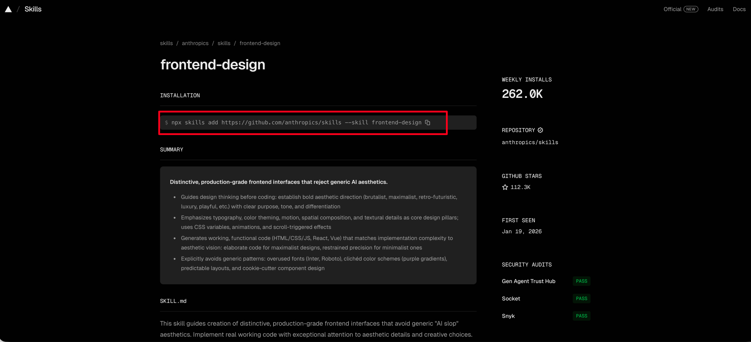 比如:https://skills.sh/anthropics/skills/frontend-design