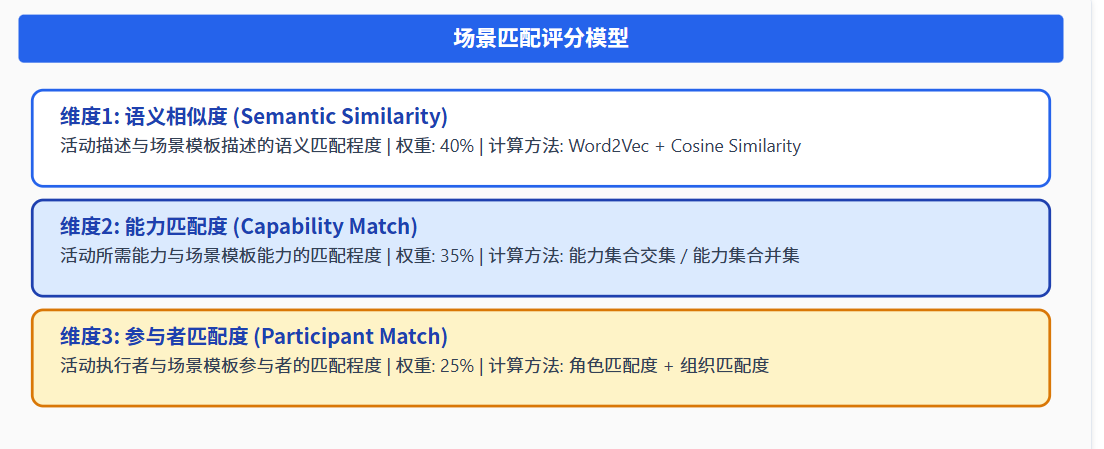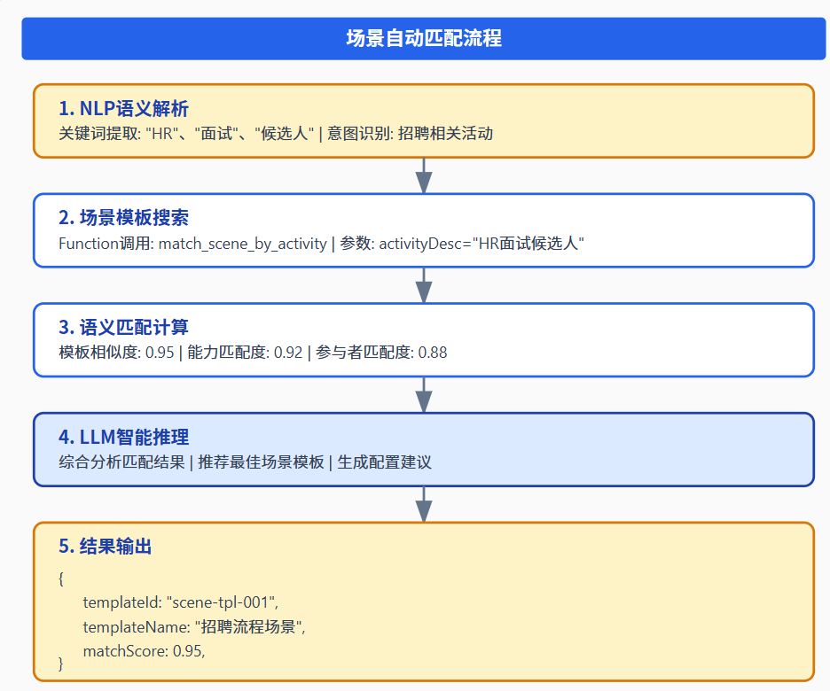 场景自动匹配是场景驱动架构的核心能力,实现从活动描述到场景模板的智能映射: