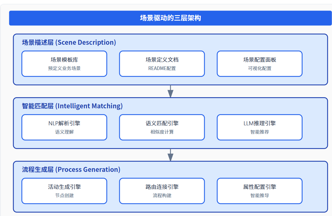 我们设计了"场景中心"的三层架构,实现从场景描述到流程定义的完整链路: