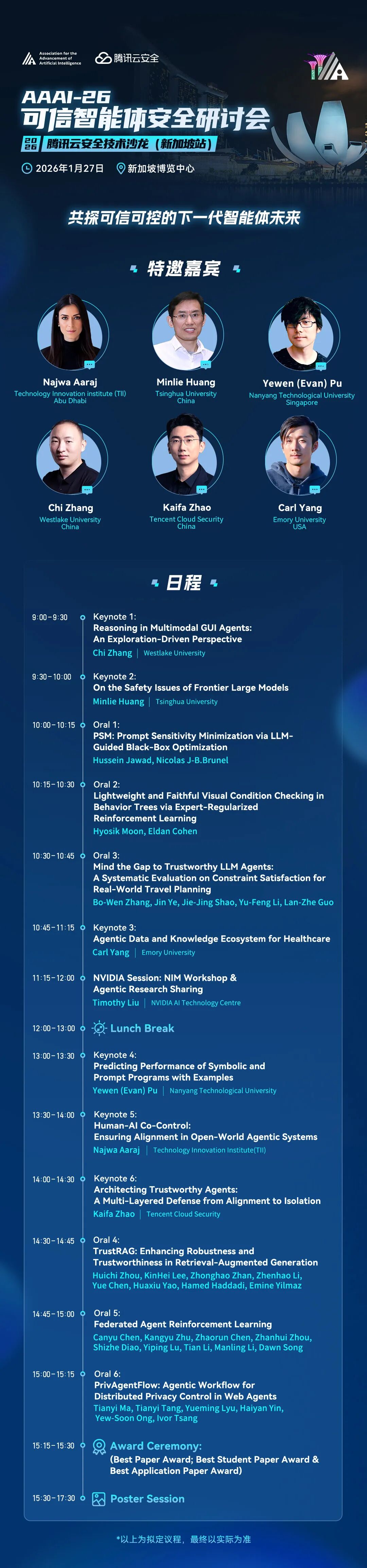 2026年1月27日,AAAI 2026 Workshop “How Can We Trust and Control Agentic AI?” 将于新加坡博览中心举行。本次研讨会由腾讯云安全与A*STAR(新加坡科技研究局)等团队联合举办,旨在汇聚全球顶尖研究力量,深入探讨智能体的可信可控问题,携手为Agentic AI技术奠定坚实的安全基石。