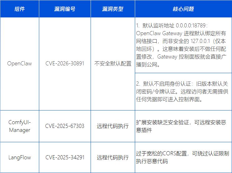 近年来,多个主流 AI 开源组件被披露存在因配置缺陷导致的高危问题。这类问题往往具有共同特点:组件为了易用性/可扩展性,提供了“可远程触发的高权限能力”;而默认配置、暴露面判断或配套鉴权措施不足时,就会被攻击者利用。
