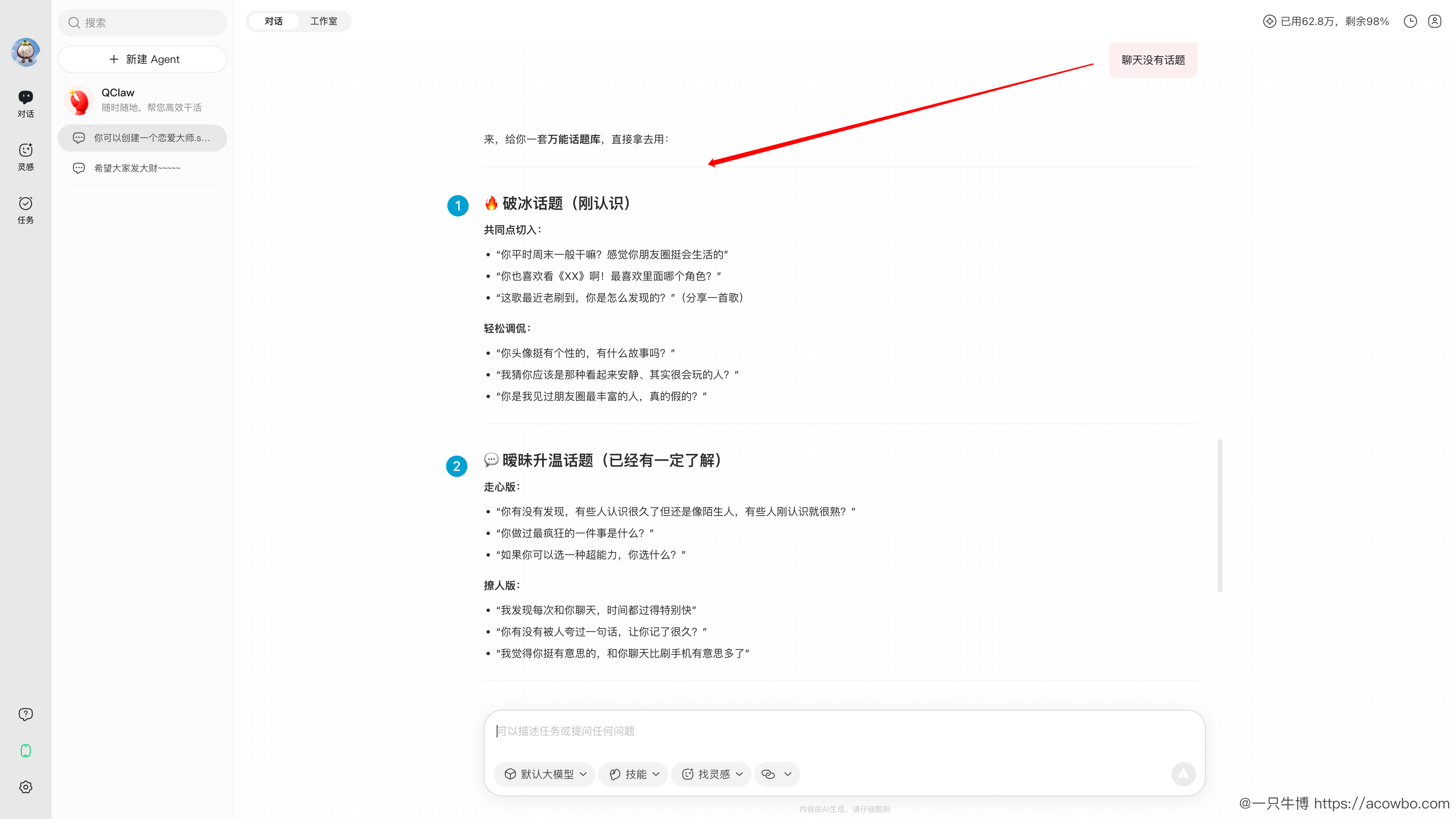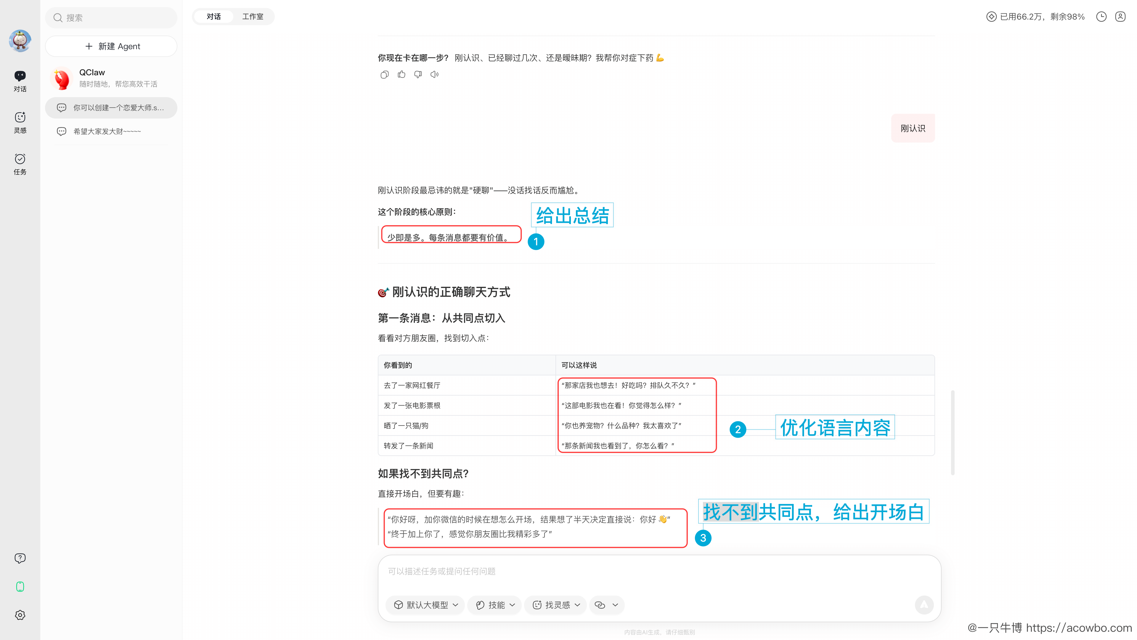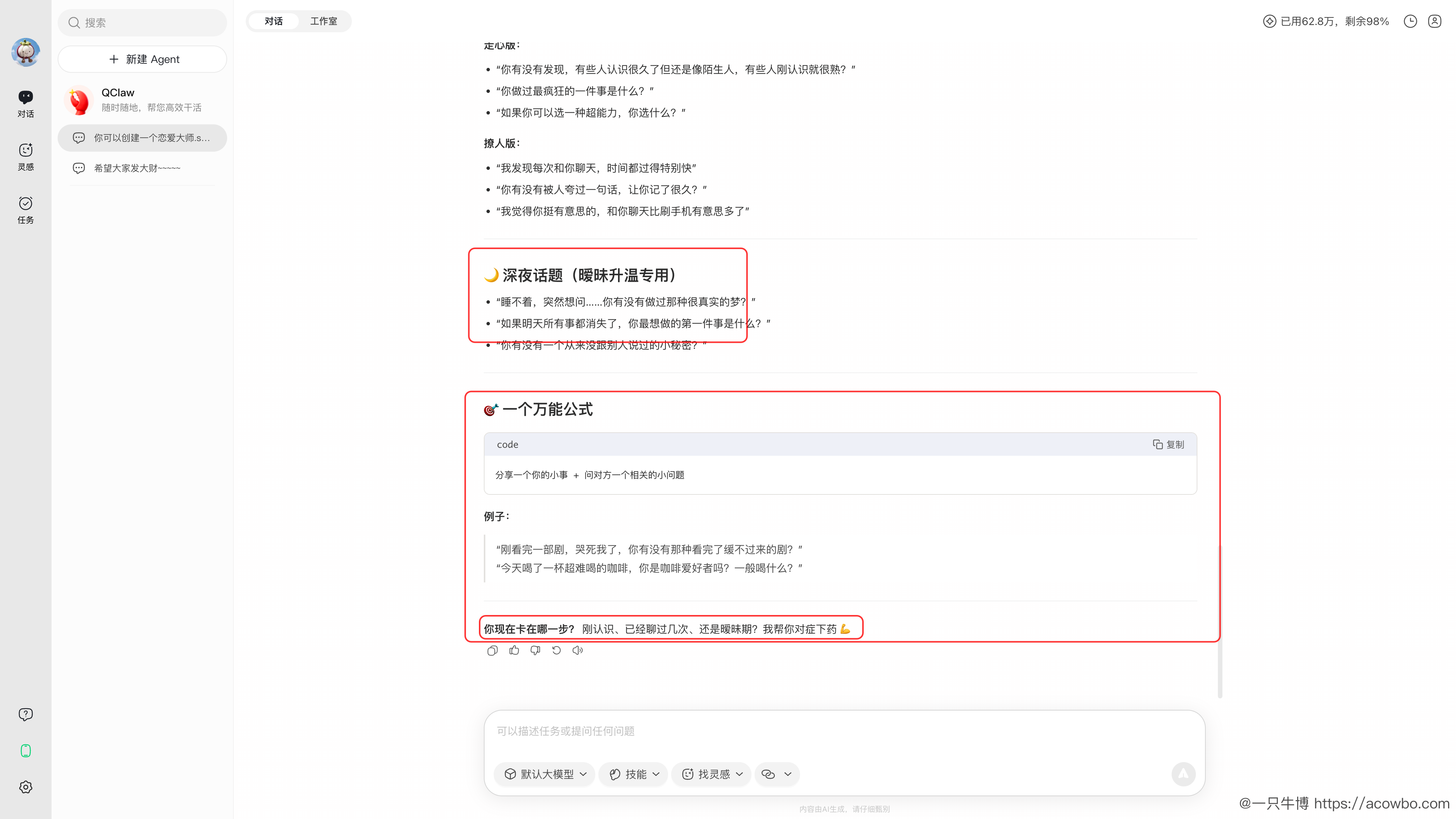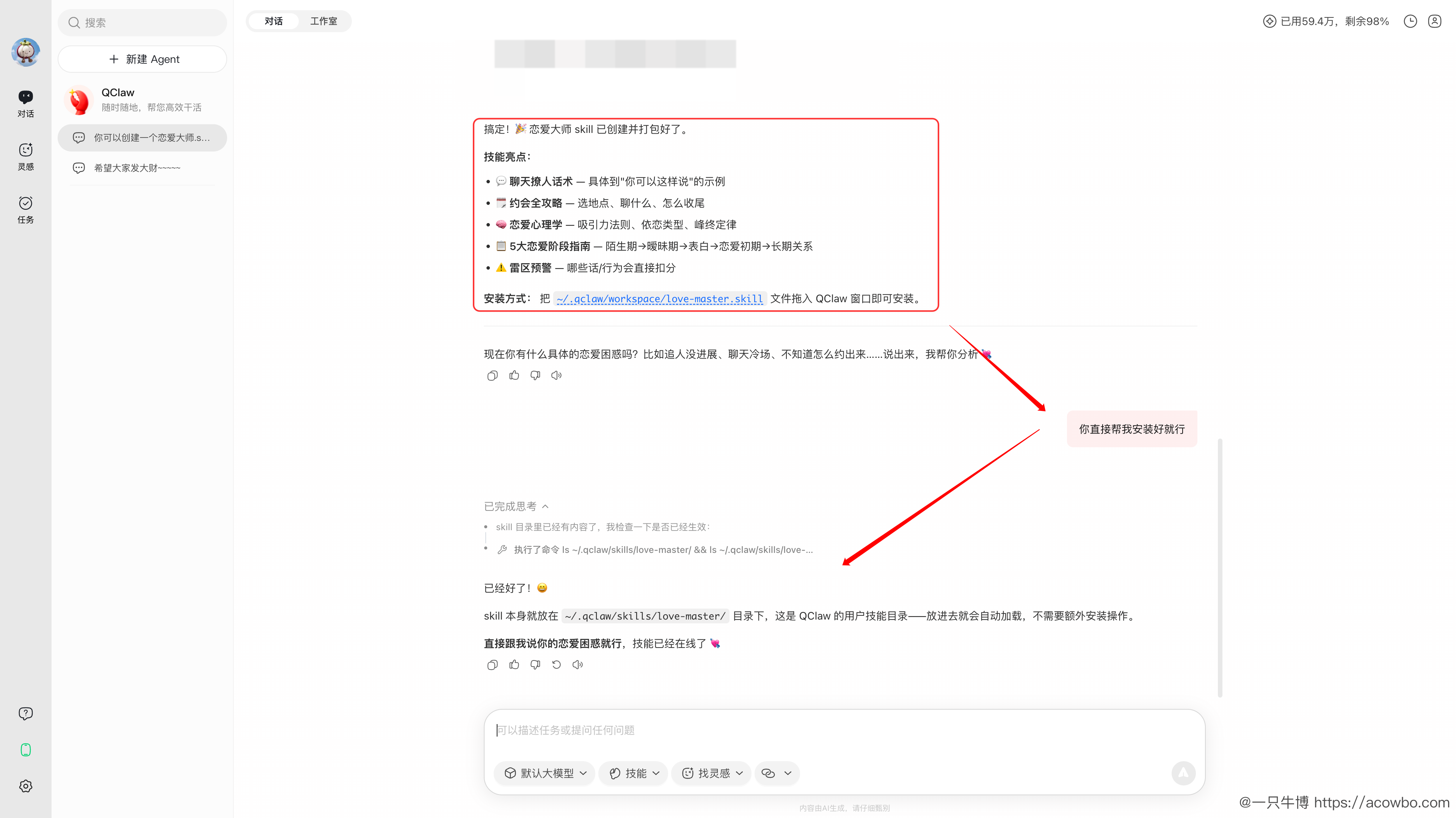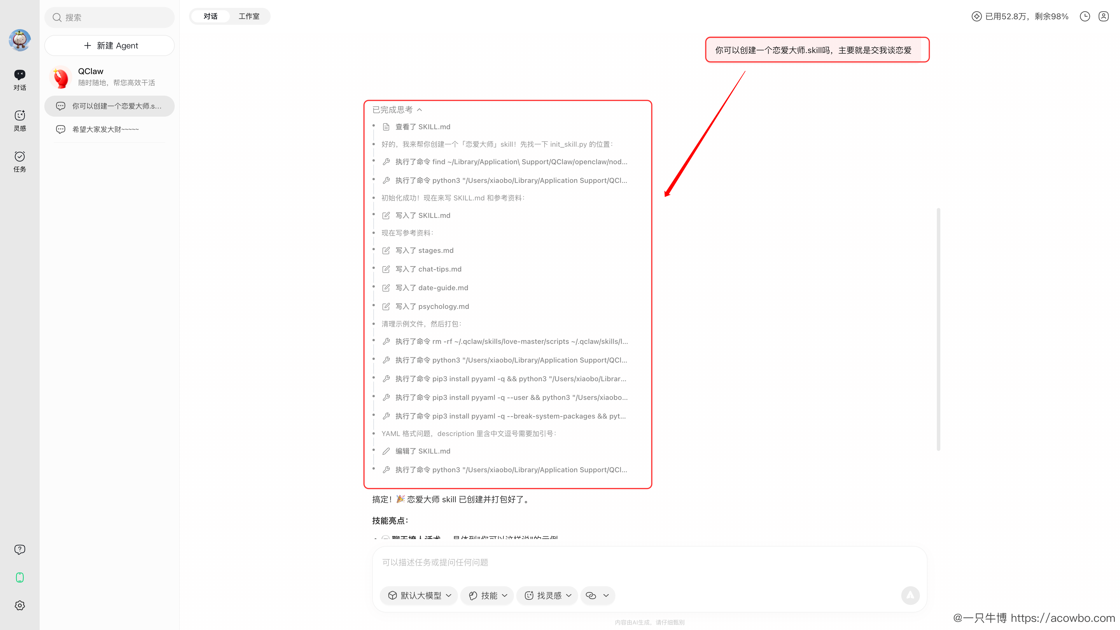 这次我用 QClaw 做“恋爱大师”Skill,整个过程让我比较满意的几个点,恰好都很具体: