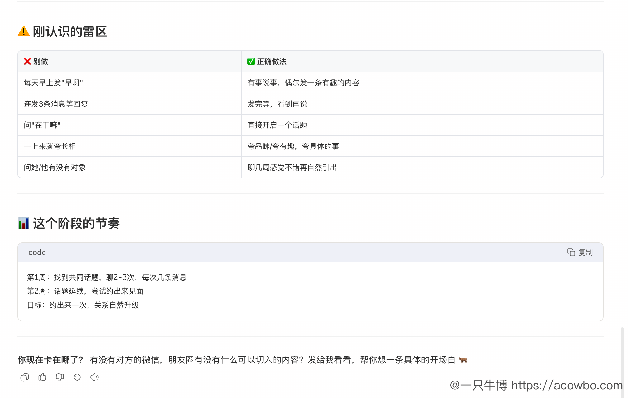 接着它还顺手总结了一版“刚认识阶段的雷区”。