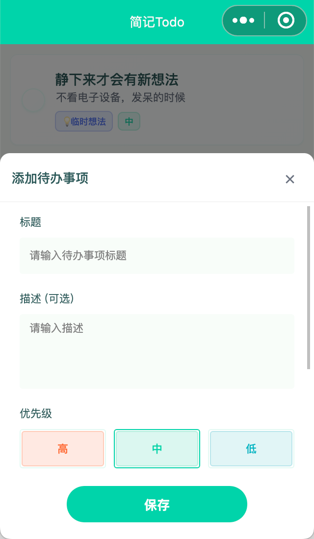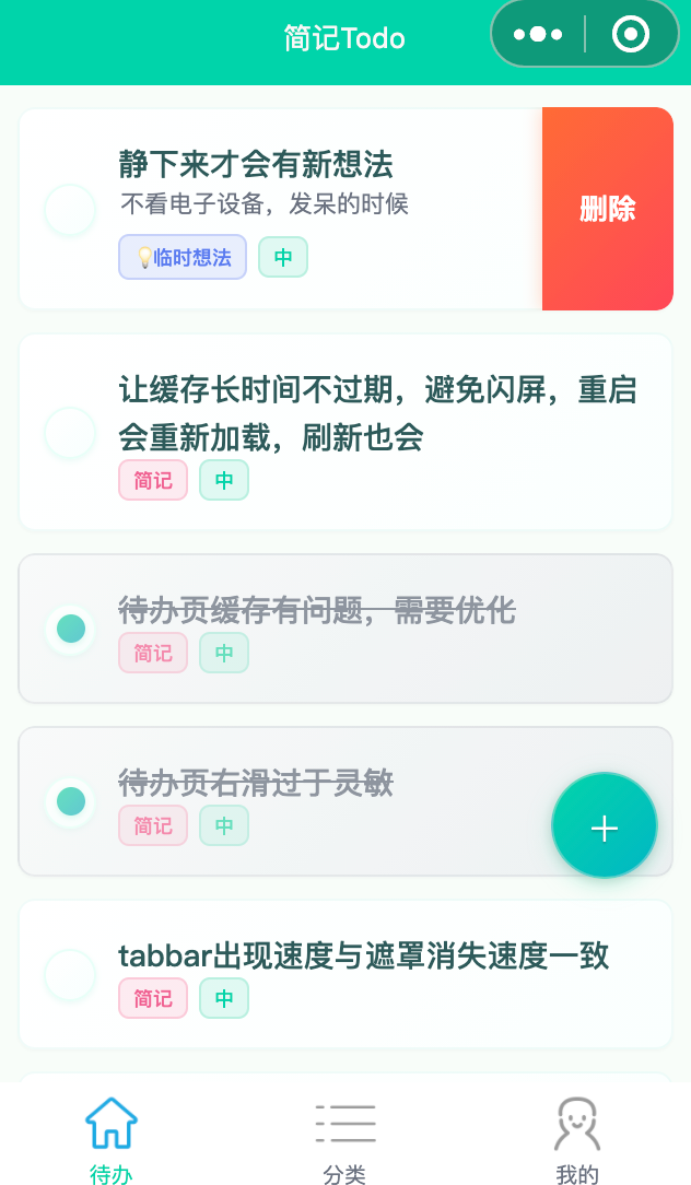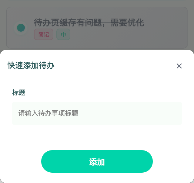 效果是不是还可以,还用 AI 做了右滑删除的效果。为了使用方便,我给右下角的按钮绑定了两个事件,点击是快速添加: